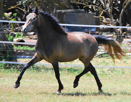 Tested Ee AA (bay with a chestnut gene). She is in foal to the palomino andalusian stallion Lourinho AFA (Saphiro x Heredera) Due July 2013. Dulcie is sweet as her name, but a bold and powerful mover! She runs around